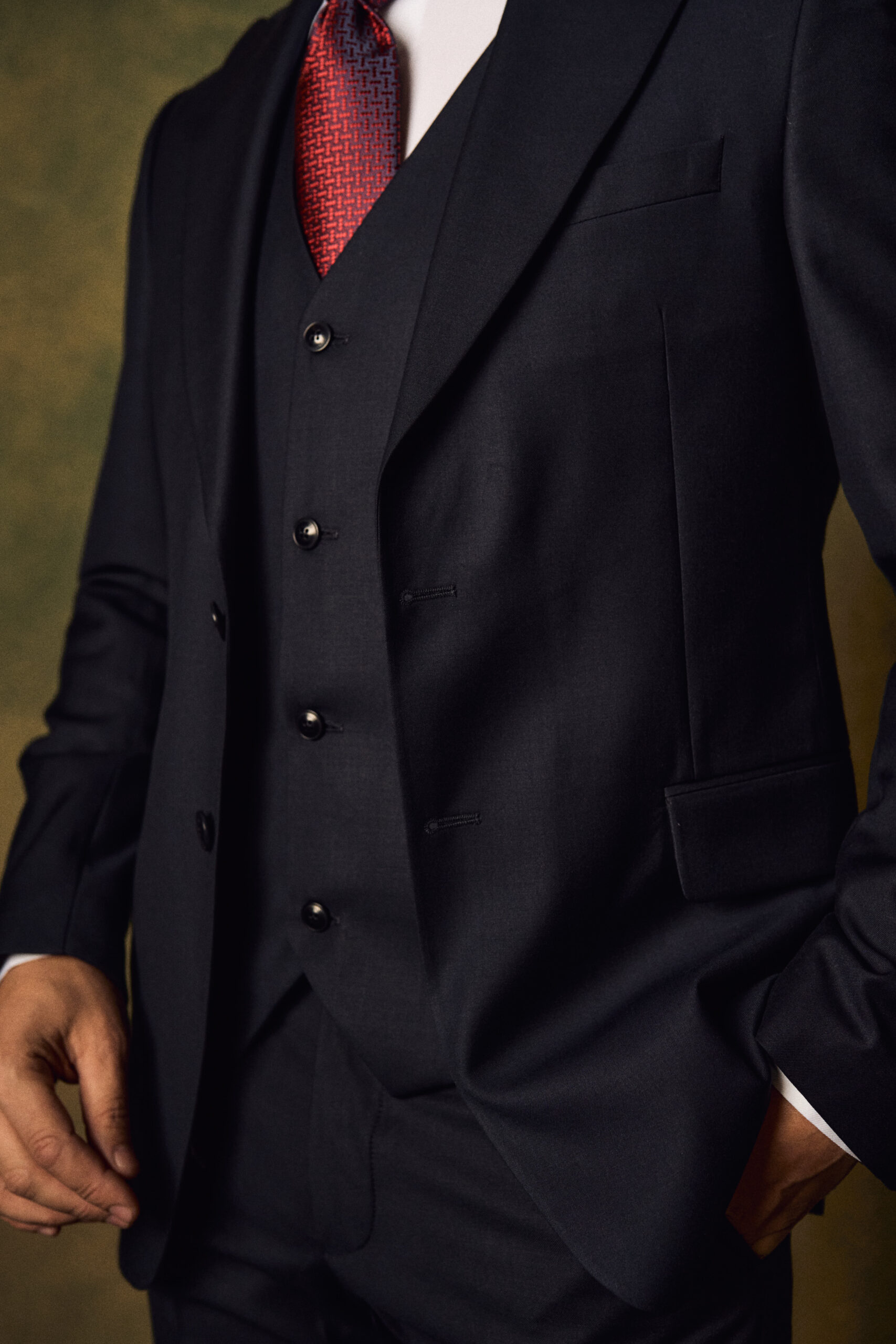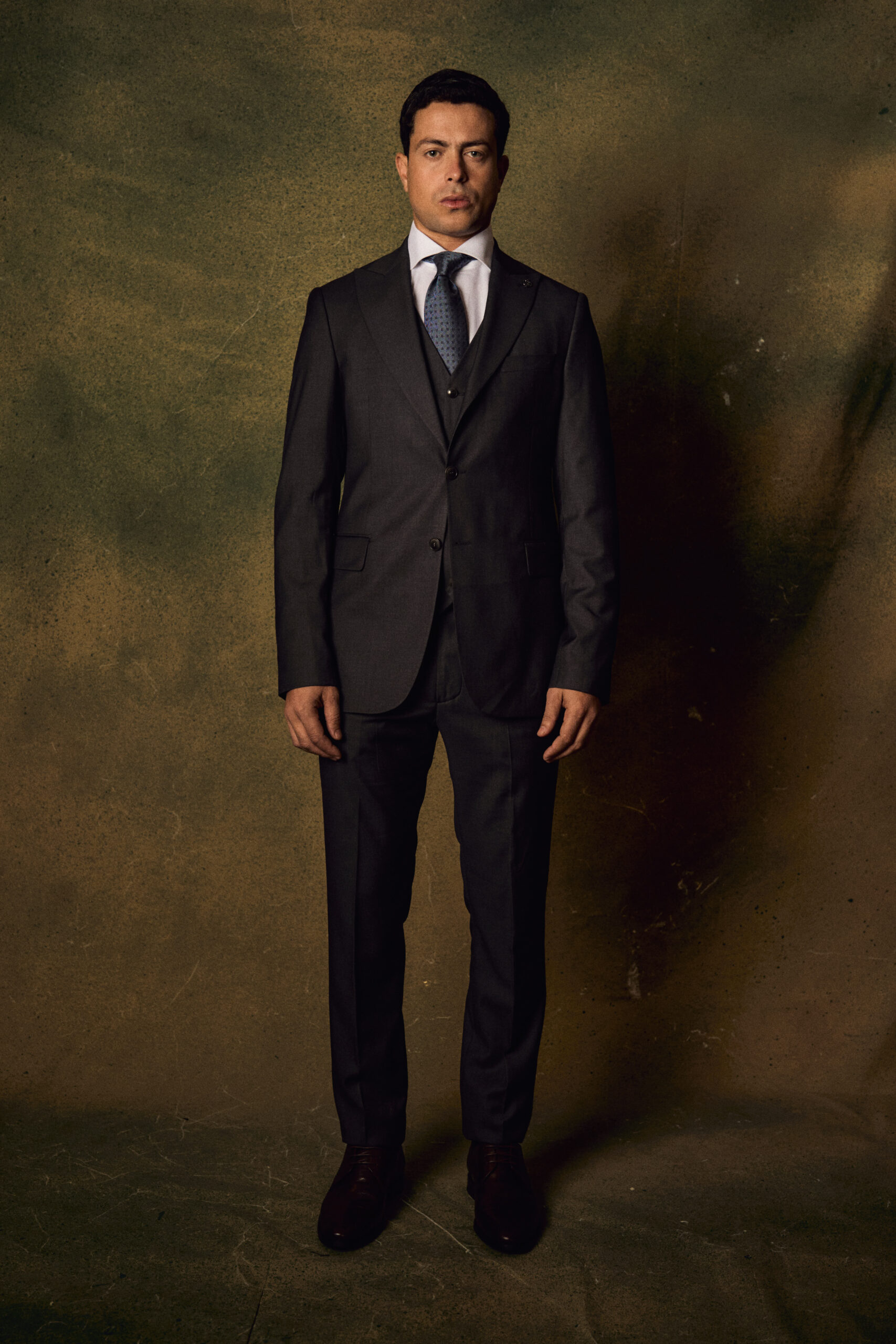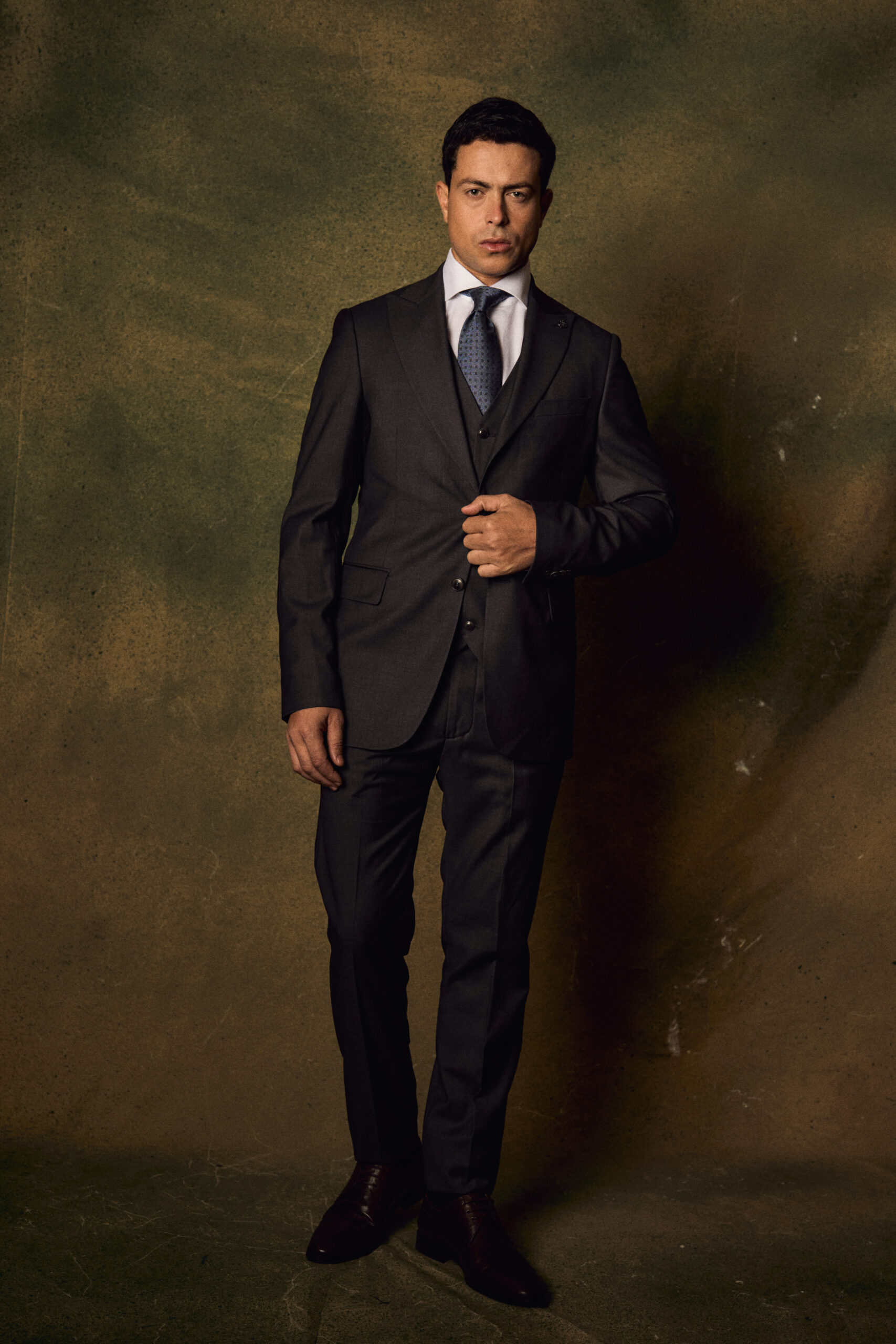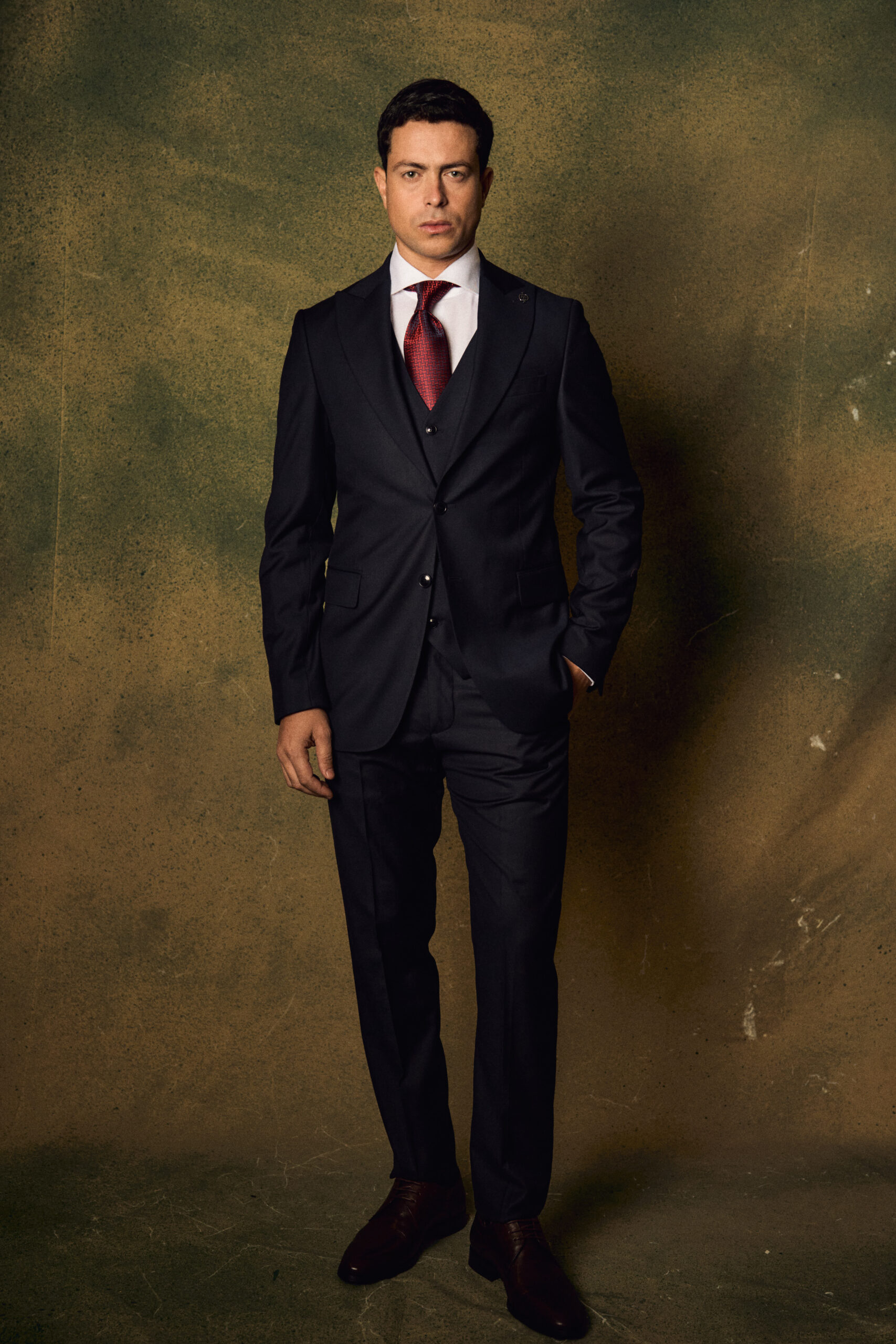 The set includes a tailored single-breasted jacket with a structured shoulder line, a perfectly fitted waistcoat that enhances the overall shape, and classic straight-cut trousers for a clean, polished look. Finished with a crisp white shirt and a rich textured tie, this suit delivers a powerful and sophisticated presence.