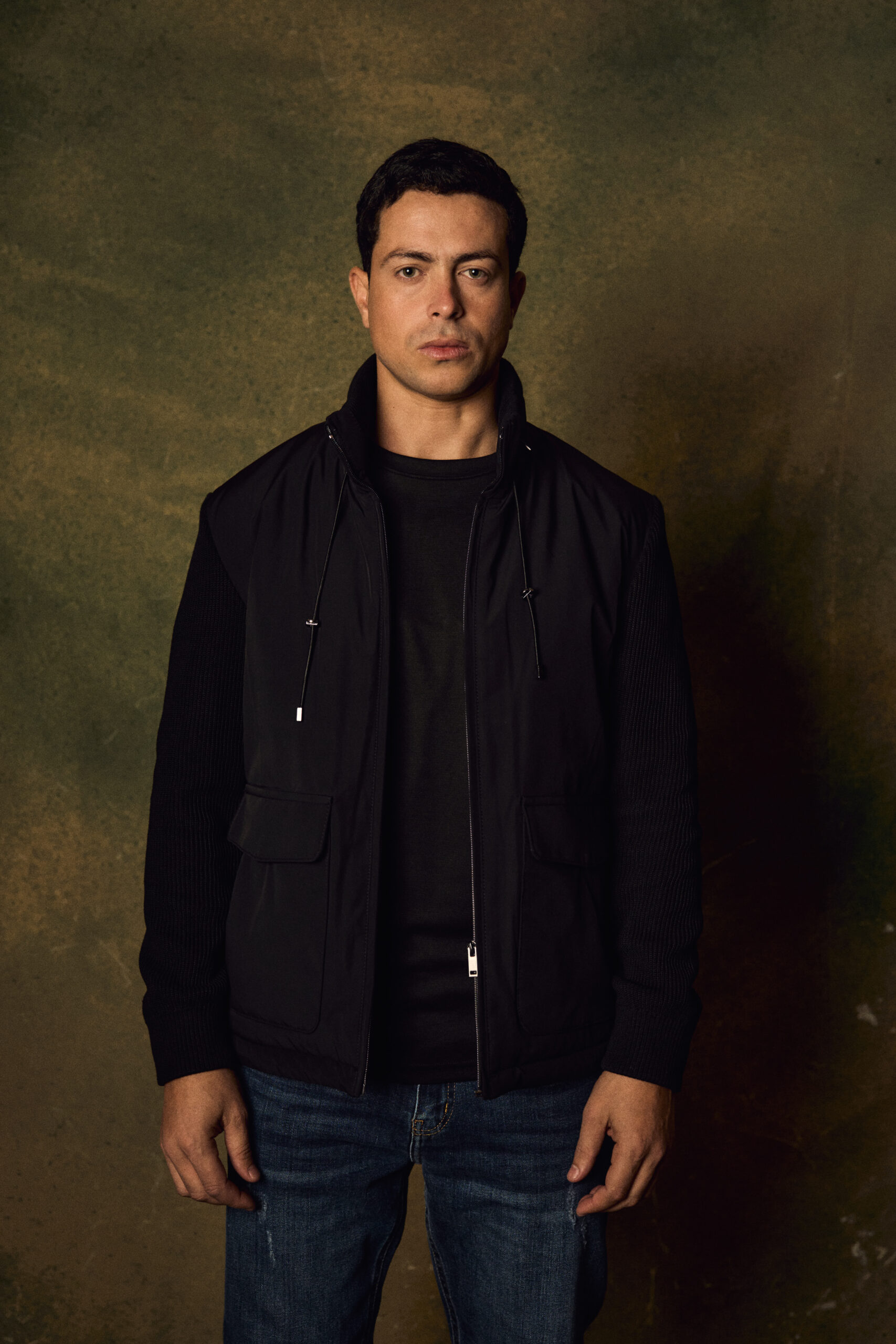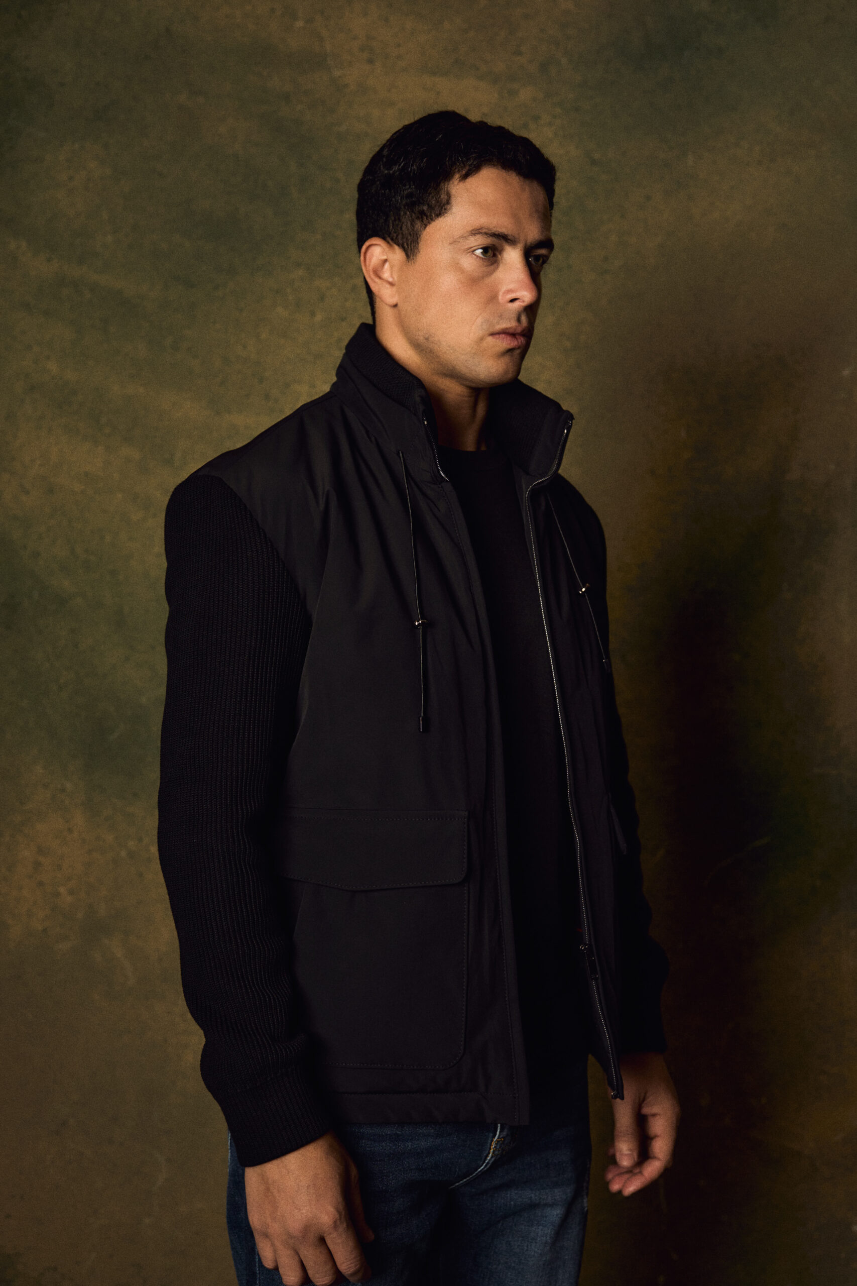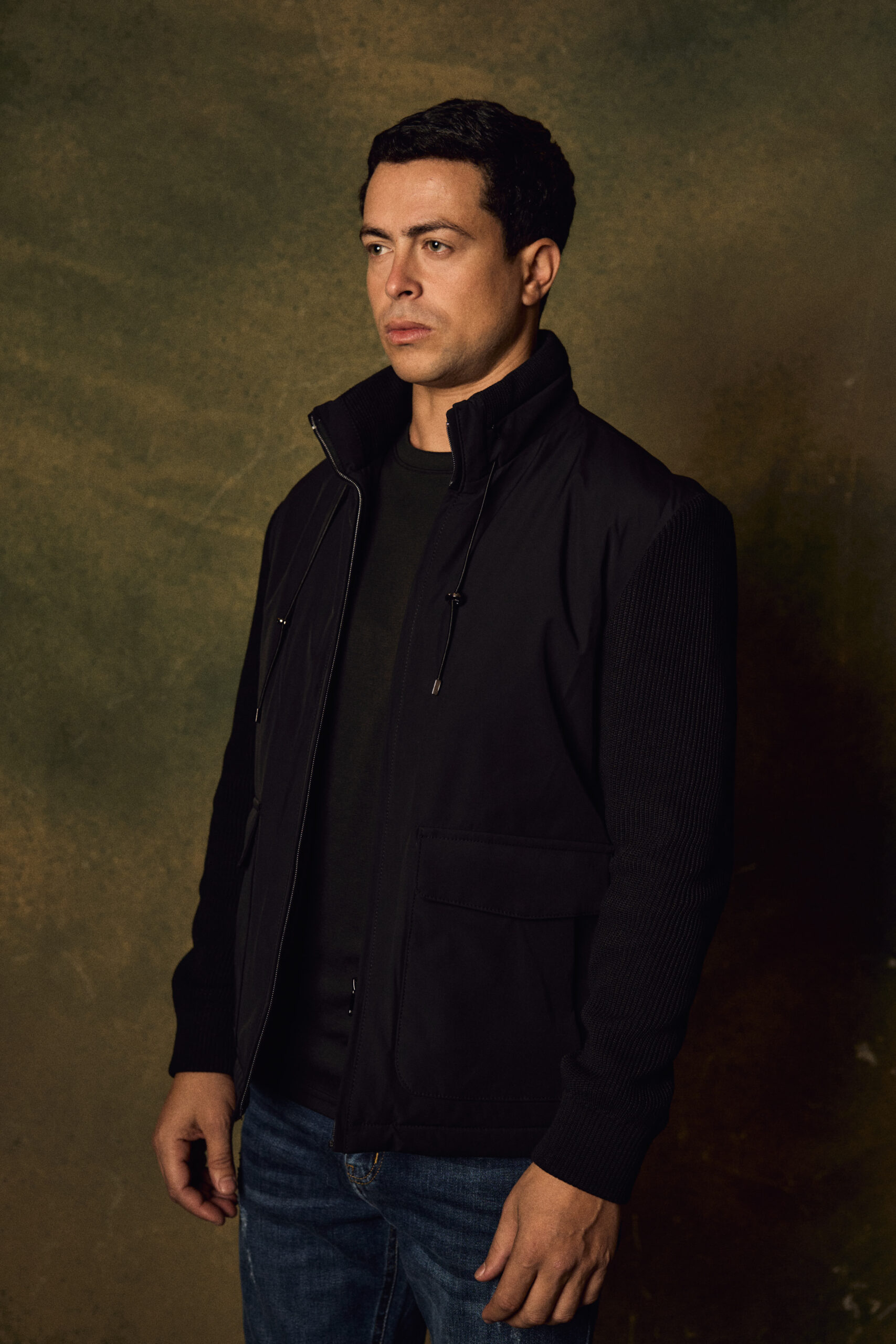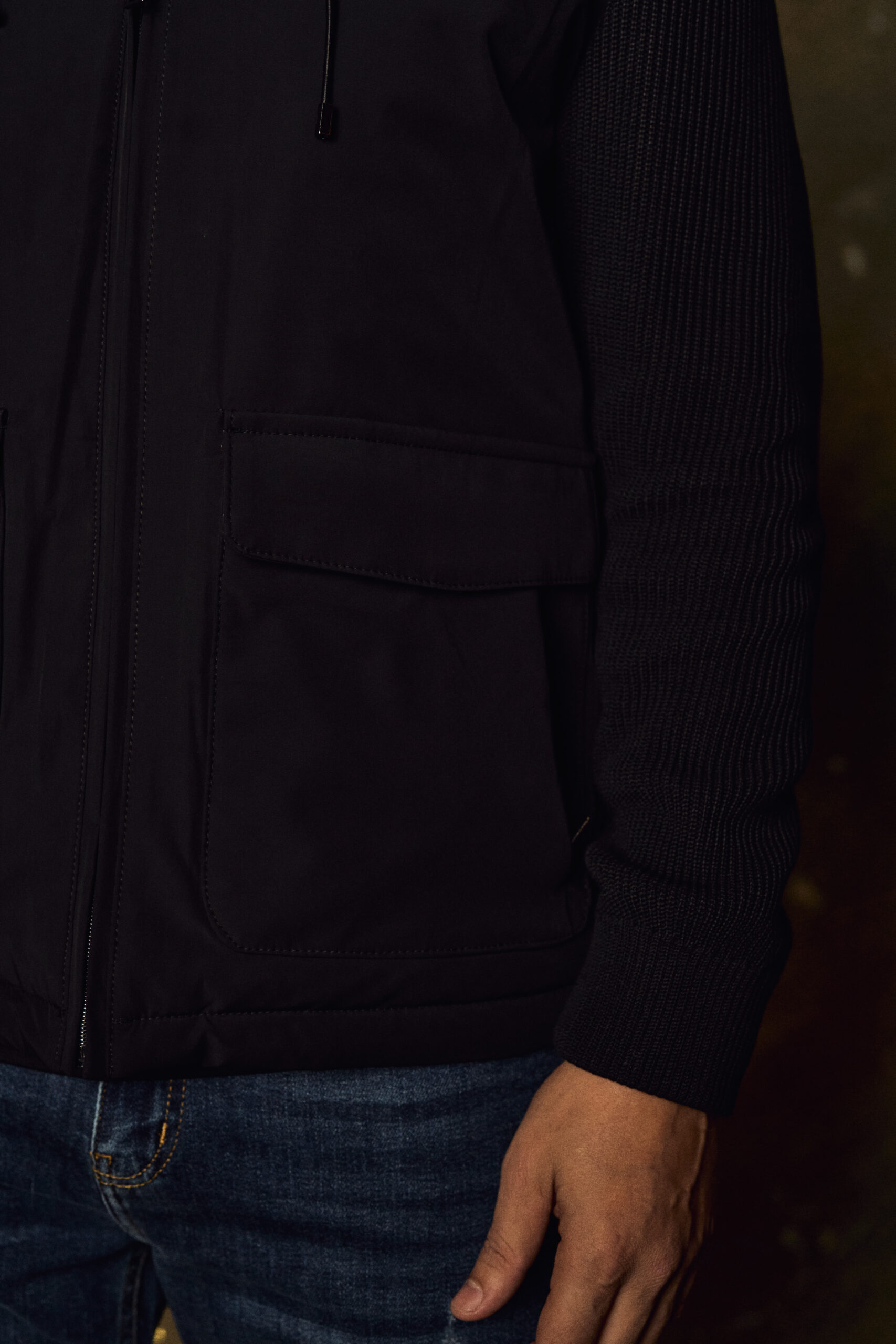 This modern hybrid jacket combines sleek technical fabric with premium knitted sleeves for a refined, contemporary look. Designed in a deep charcoal tone, it features a high stand collar with adjustable drawstrings, a full front zip closure, and two spacious flap pockets for practical functionality. The smooth, structured body contrasts elegantly with the rib-knit sleeves, offering both warmth and flexibility.