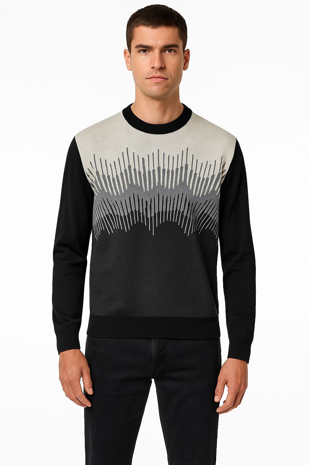 Crewneck sweater made with jacquard technique. This pullover is trimmed with ribbed knit and a sweatshirt-inspired front insert.