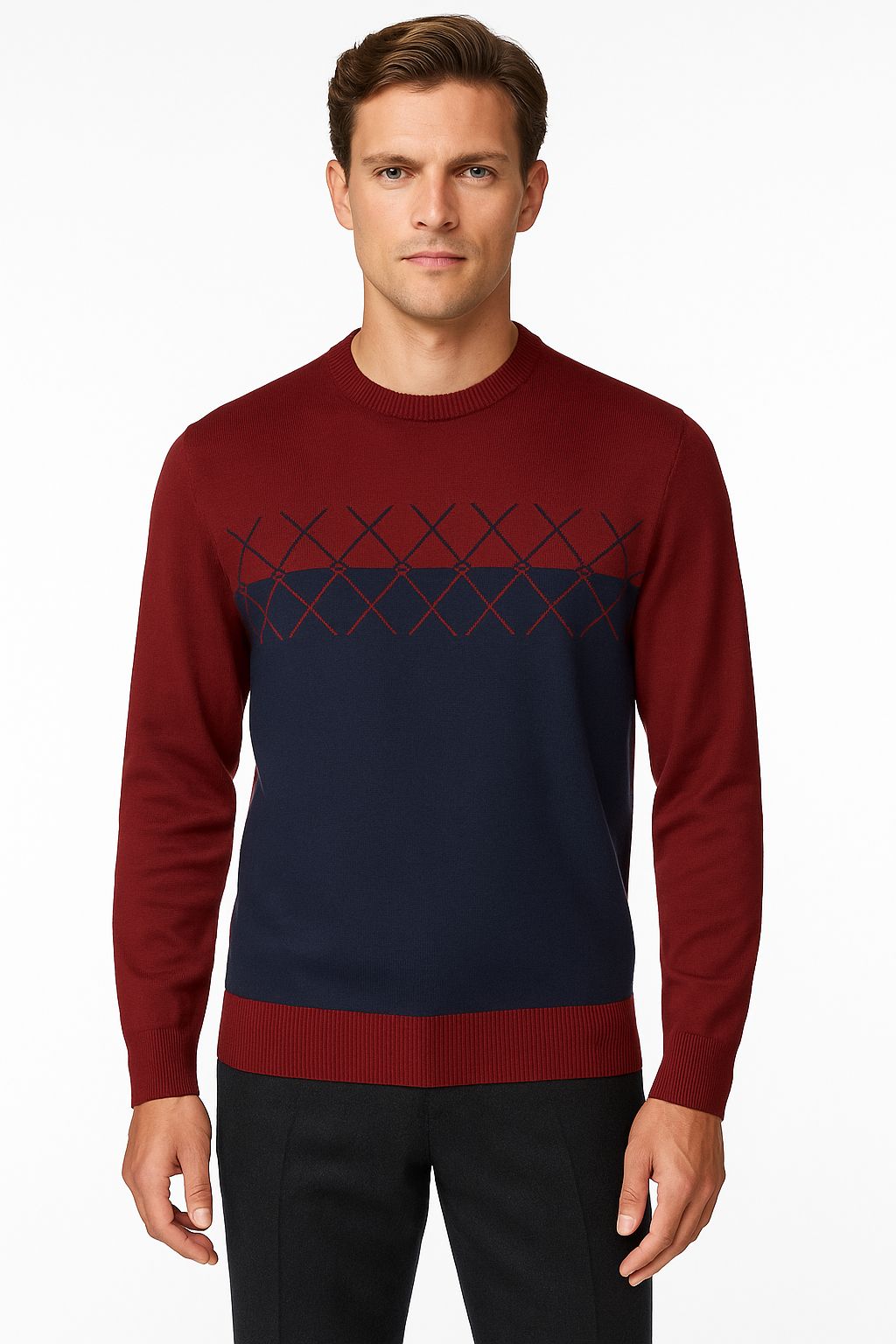 Crewneck sweater made with jacquard technique. This pullover is trimmed with ribbed knit and a sweatshirt-inspired front insert.